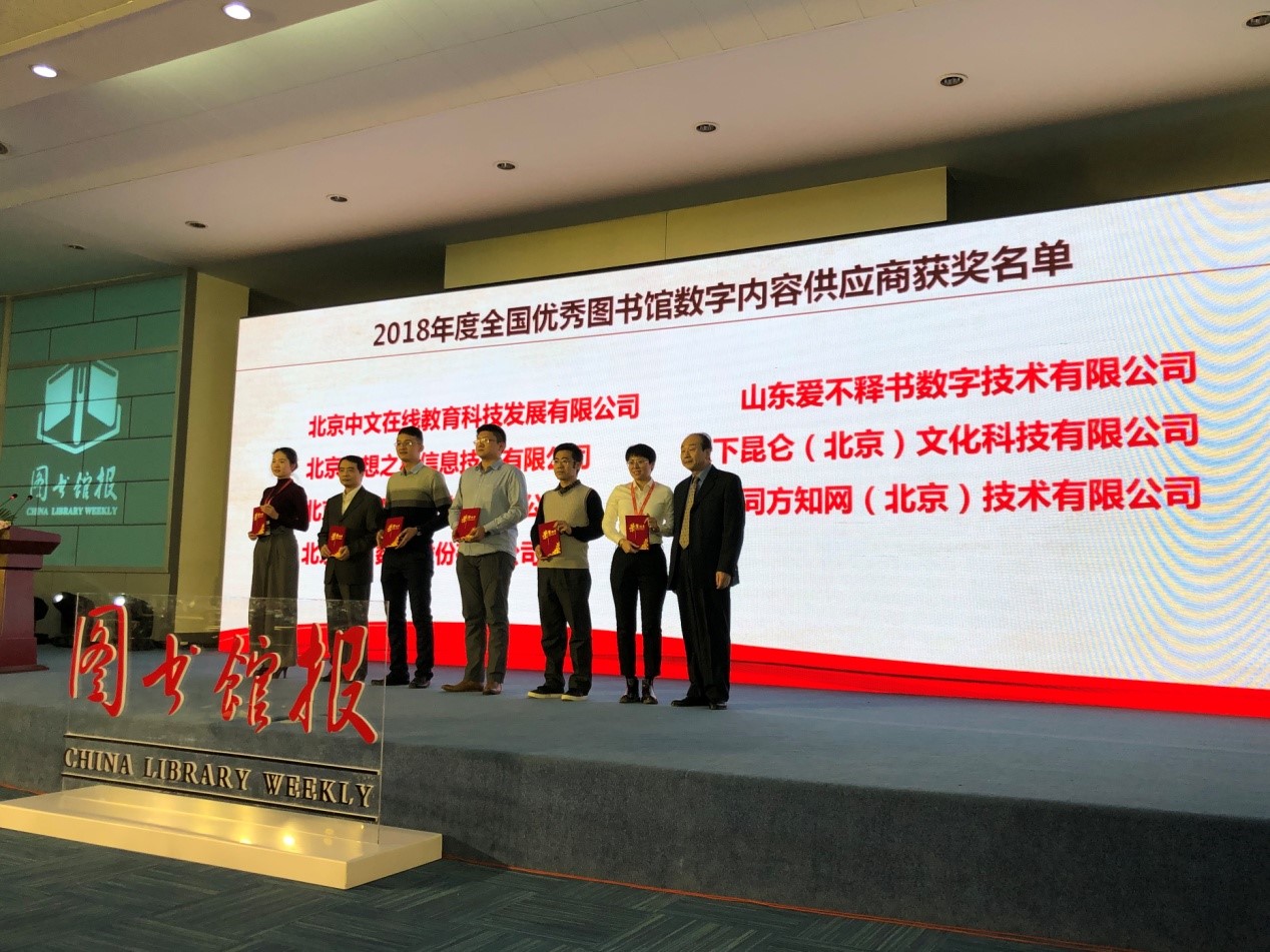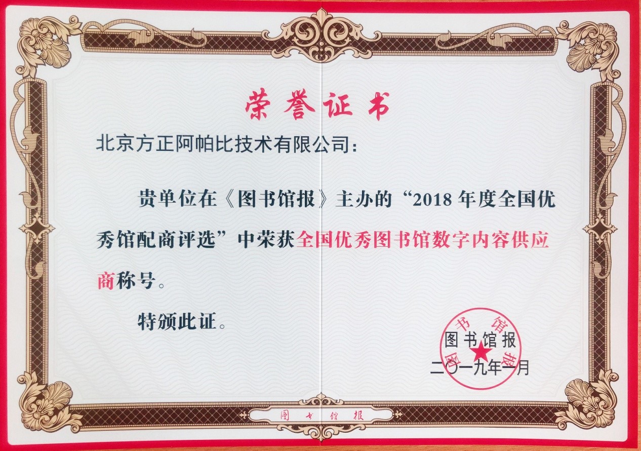 論壇期間進行了全國優(yōu)秀館配商頒獎典禮,這是館配行業(yè)共建共享的權威評選活動,也是業(yè)內(nèi)公認的評價館配企業(yè)的重要參考指標。在2018全國優(yōu)秀館配商評選活動中,北京方正阿帕比技術有限公司脫穎而出,獲得“2018全國優(yōu)秀圖書館數(shù)字內(nèi)容供應商”殊榮。