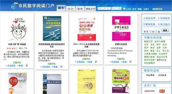 上海圖書館在上海圖書館建館60周年之際,上海圖書館推出“上海市民數(shù)字閱讀推廣計劃”,2012年主題是“館藏數(shù)字資源介紹及新技術體驗互動”。據(jù)介紹,該閱讀平臺為上海市民數(shù)字閱讀的統(tǒng)一入口,讀者證登錄一次即可使用網(wǎng)站的所有資源,不分卡的功能權(quán)限。資源上包括50萬冊方正電子書、400余種方正數(shù)字報、1000余種時尚期刊及多種多媒體館藏精品,并且資源會在首頁上動態(tài)滾動呈現(xiàn)。