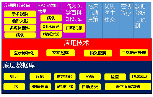依托于方正阿帕比醫(yī)藥領(lǐng)域相關(guān)的豐富底層資源,應(yīng)用中文分詞技術(shù)、非結(jié)構(gòu)化信息抽取、文本挖掘、自然語言處理、語義搜索和數(shù)據(jù)統(tǒng)計分析預(yù)測等先進技術(shù),打造一個集臨床醫(yī)學(xué)百科知識、臨床輔助決策、PACS病例教學(xué)、在線診療、遠程醫(yī)療教育等功能于一體的醫(yī)療知識服務(wù)平臺,從而為醫(yī)學(xué)院學(xué)生和住院醫(yī)師提供學(xué)習(xí)參考,提高廣大基層醫(yī)療人員的醫(yī)療水平,為醫(yī)生提供臨床輔助決策,提供優(yōu)質(zhì)醫(yī)生互動交流和學(xué)習(xí)提高平臺,為醫(yī)院和醫(yī)療監(jiān)管部門提供數(shù)據(jù)分析和趨勢預(yù)測。