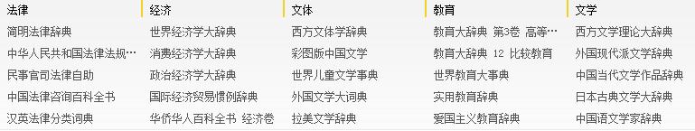 主要收錄國內(nèi)各大出版社各個(gè)領(lǐng)域的權(quán)威工具書,目前已經(jīng)收錄了《中國大百科全書》、《漢語大詞典》、《辭海》等權(quán)威工具書;